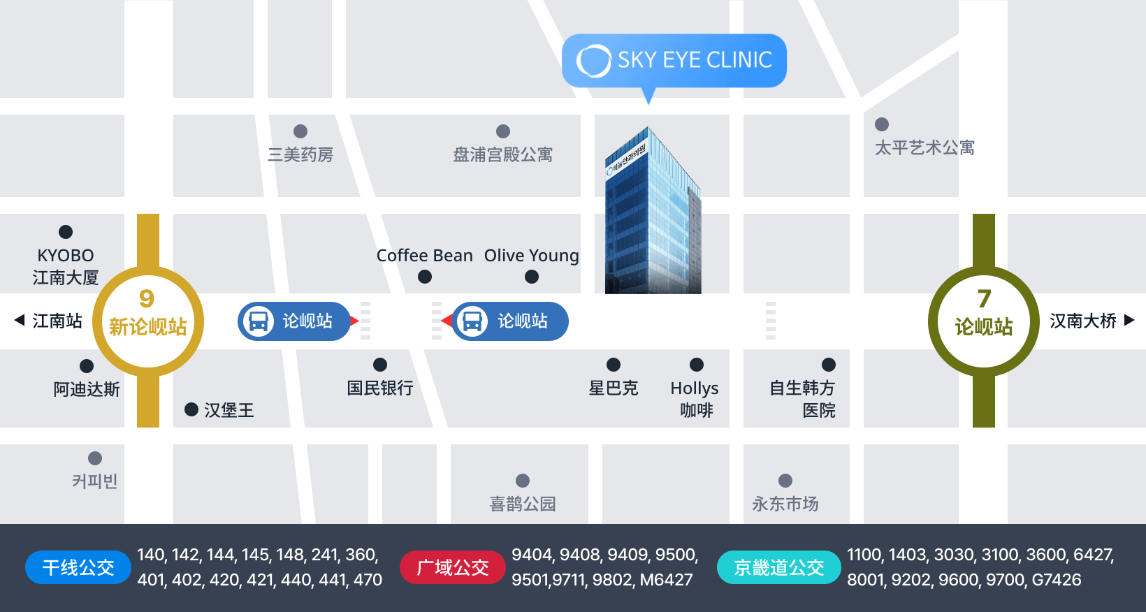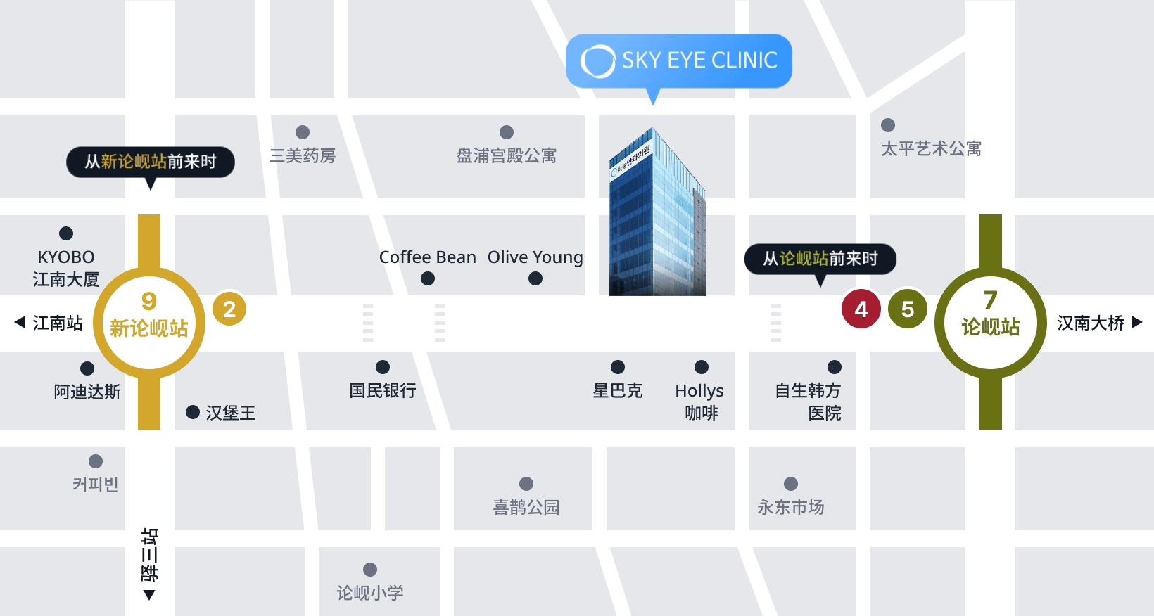 地铁9号线金浦机场站向新论岘方向乘车 ▶ 9号线新论岘站下车 (2号出口)