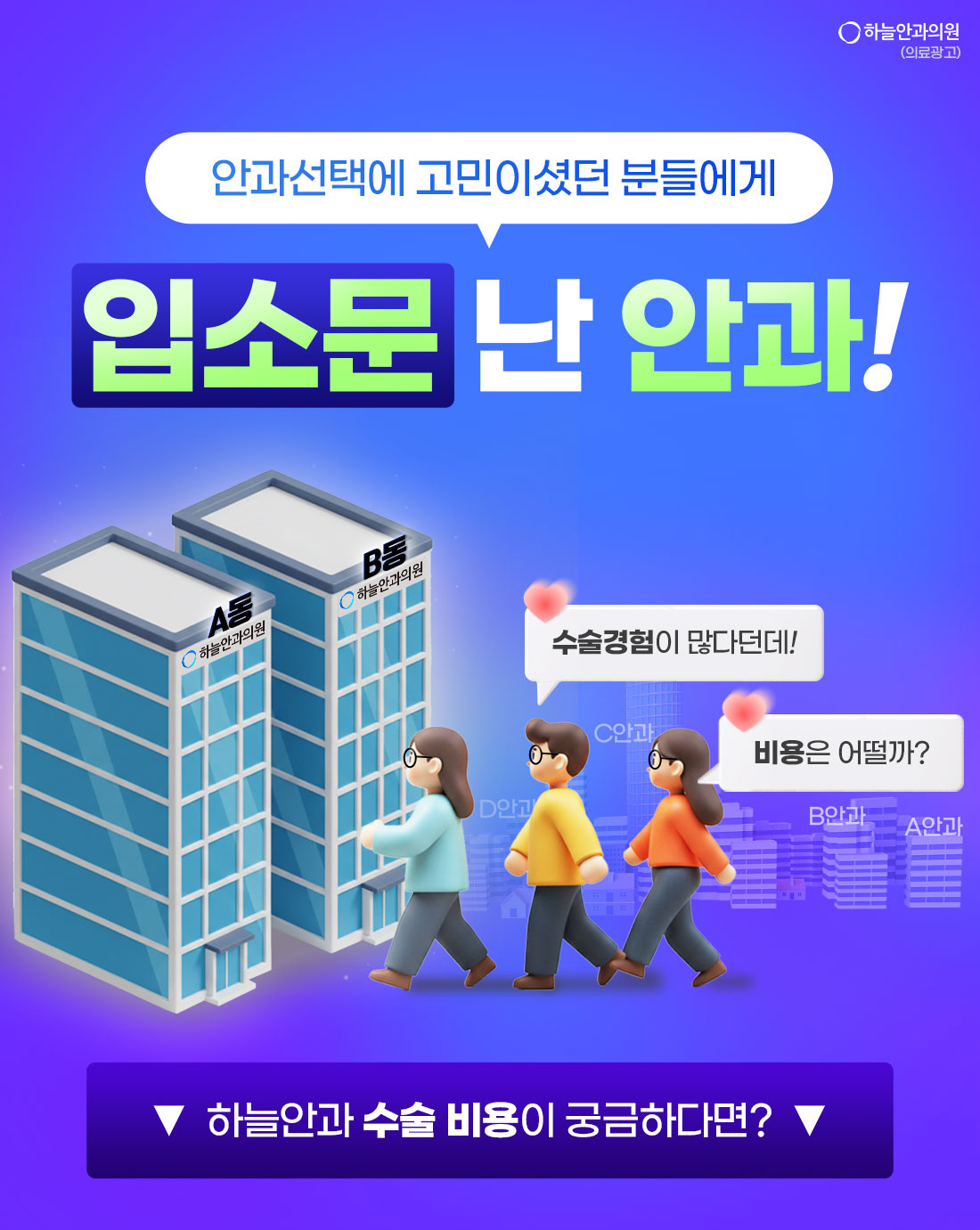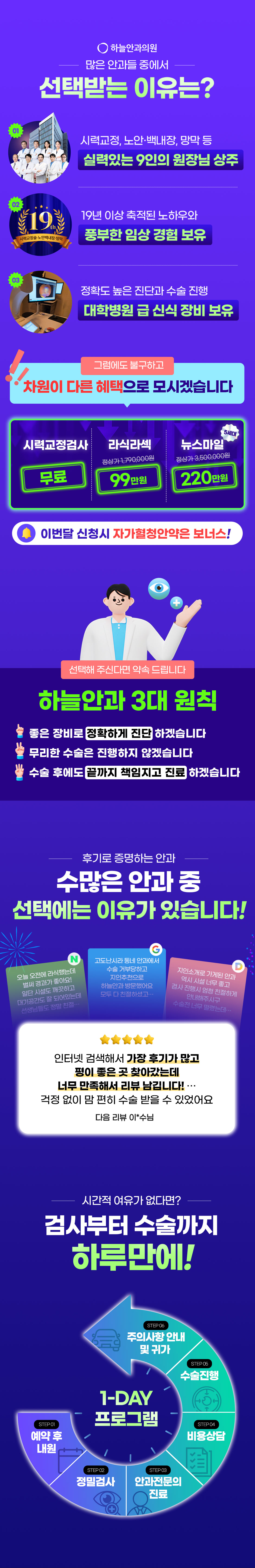 · 개인정보 수집자 : 하늘안과의원 02.573.9779 · 수집하는 개인정보의 항목 : 이름,나이,핸드폰번호 · 개인정보 수집·이용목적 : 검사상담활용(전화,SMS) · 개인정보 보유 및 이용기간 : 개인정보 수집일로부터 3년 (개인정보동의 철회요청시 지체없이 파기)