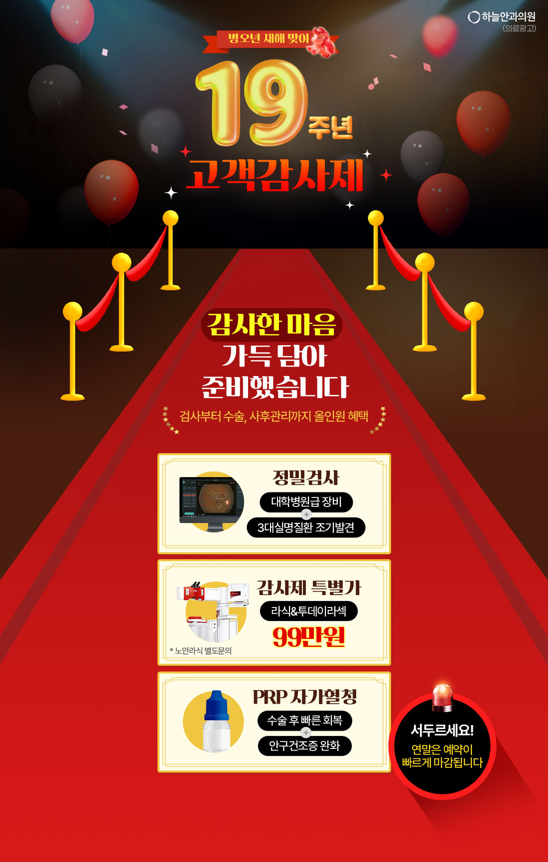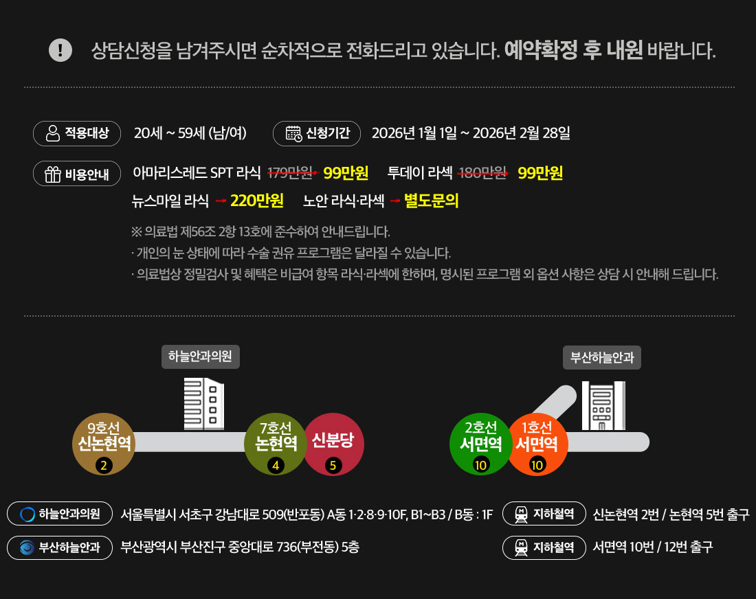 · 개인정보 수집자 : 하늘안과의원 02.573.9779 · 수집하는 개인정보의 항목 : 이름,나이,핸드폰번호 · 개인정보 수집·이용목적 : 검사상담활용(전화,SMS) · 개인정보 보유 및 이용기간 : 개인정보 수집일로부터 3년 (개인정보동의 철회요청시 지체없이 파기)